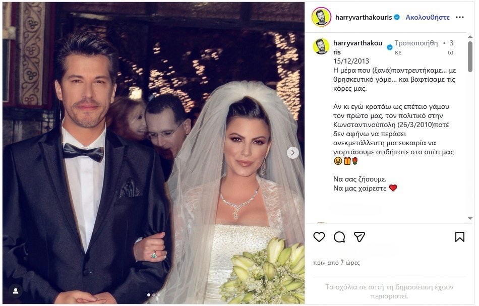 Με ανάρτησή του στο Instagram, ο Χάρης Βαρθακούρης θυμήθηκε μια από τις πιο σημαντικές ημέρες της ζωής του, αυτή του θρησκευτικού γάμου του με την Αντελίνα, αλλά και της βάπτισης των δύο κορών τους.