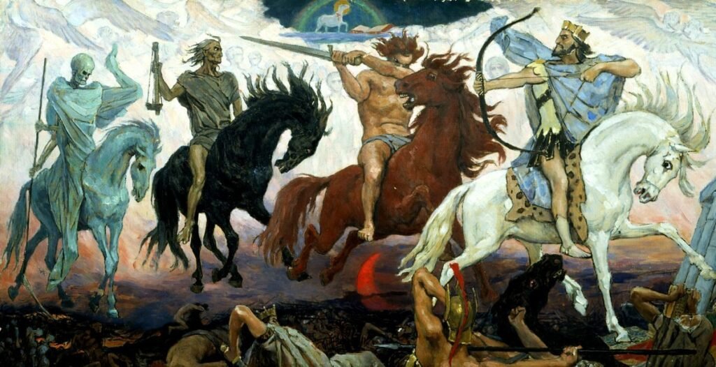 Οι Τέσσερις Ιππότες της Αποκάλυψης: Αυτοί οι ιππότες, που οδηγούν την καταστροφή στον κόσμο, αντιπροσωπεύουν τις μεγάλες κρίσεις που θα πλήξουν την ανθρωπότητα: τον πόλεμο, την πείνα, την αρρώστια και τον θάνατο.
